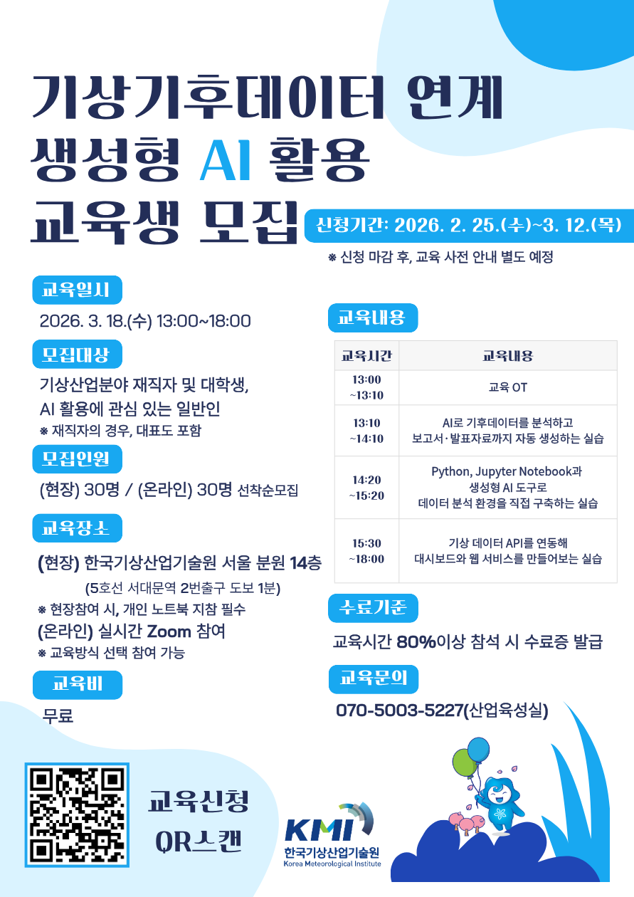 한국기상산업기술원에서는 기상기후데이터와 연계한 생성형 AI활용 교육을 통해 AI 데이터 기반 분석 자동화 역량을 확보하고 기상산업 직무 전반의 AI 활용 능력을 향상하고자 본 교육을 개설하였습니다. 이에 많은 관심과 참여 바랍니다.